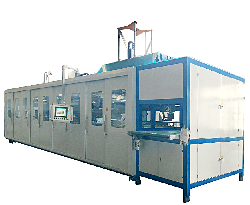 工藝過程: 片材自動上料—片材自動校正—夾持片材傳動加熱(自動)—夾持烘烤的材料傳動雙模分步成型(自動)—合模熱壓成型同步裁斷(自動)—冷卻(自動)——反吹氣脫模(自動)—雙模分開(自動)—取件(自動)——產(chǎn)品掉入料倉成品流出